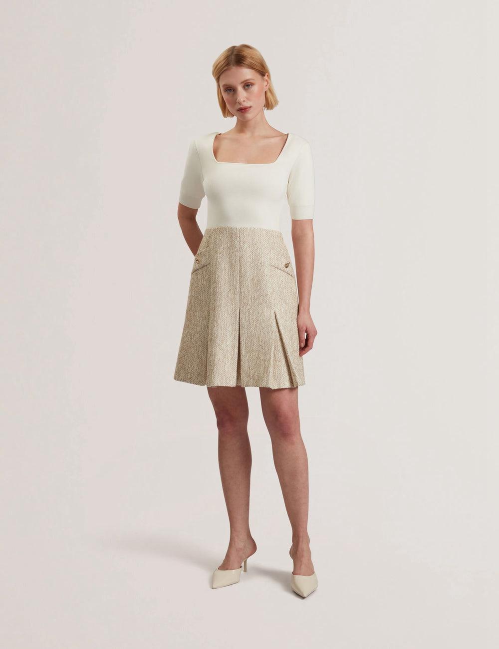 Women Ted Baker VULPAD - Pleated Boucle With Knit Bodice Mini Dresses Ivory | Australia 80419-YDLF